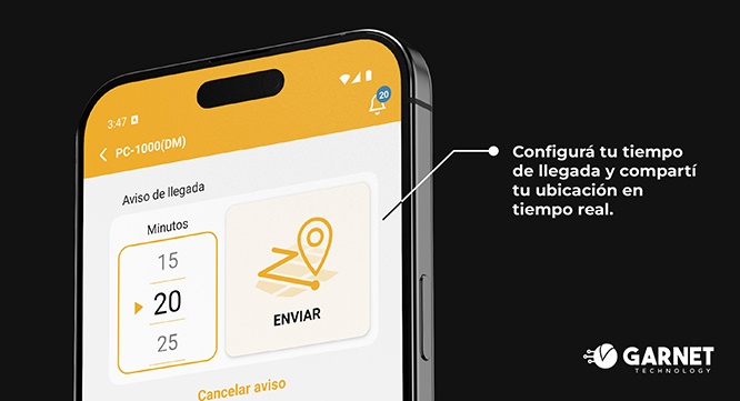 Para garantizar un uso eficiente, Garnet Control Pro actualiza la ubicación únicamente cuando el usuario se desplaza más de 20 metros, reduciendo el consumo de batería y datos móviles. Además, incorpora la opción de “Posponer llegada”, extendiendo 10 minutos adicionales antes de generar la alerta automática. El Aviso de Llegada es ideal para acompañar a familiares, empleados o cualquier integrante de la Comunidad, asegurando que cada desplazamiento esté respaldado por tecnología inteligente y una red de apoyo inmediata.