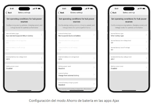 En el modo Ahorro de batería, el Hub BP Jeweller puede funcionar hasta 25 meses alimentado por una batería interna de Ajax. La versión sin carcasa ofrece hasta 50 meses de autonomía, según la configuración de la batería.