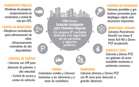 La solución de HikVision para Ciudades Seguras ofrece una gama completa de productos diseñados para ayudar a las autoridades en la implementación estratégica de sistemas inteligentes de videovigilancia en distintas áreas como edificios de gobierno, espacios urbanos, transporte público, puertos, estaciones de tren, aeropuertos, autopistas, hospitales, escuelas, patrulleros y centros turísticos entre otros cientos de objetivos críticos en la estructura de una ciudad.