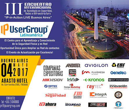 IP UserGroup, el único foro internacional y pioneros en la educación y promoción de la tecnología en seguridad electrónica, redes e infraestructura, será el anfitrión del III Encuentro Internacional de Tecnología en Seguridad "IP-in-Action LIVE Buenos Aires", evento que se llevará a cabo el Jueves 4 de Mayo 2017.