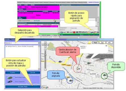 • Durante la gestión de un evento de alarma, permite al operador asignar el envío de un Móvil de respuesta o Patrulla de verificación al domicilio del cliente. En este proceso con sólo 1 click de despliega en pantalla un Mapa con la posición del domicilio del cliente y la visualización de los móviles mas cercanos (cada uno identificado por colores distintos en función de su estado, “Disponible” o “Asignado” si fuera que ha sido enviado para atender a otro domicilio) En esta instancia el operador selecciona el MÓVIL. La gestión completa de selección de móvil y asignación queda registrada en la gestión del evento para su posterior auditoría o emisión mediante reportes.