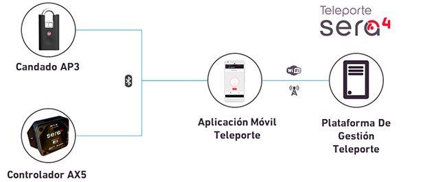 La comunicación entre el candado o el controlador y el smartphone es mediante bluetooth. Por lo tanto, los equipos pueden instalarse en zona remotas sin cobertura. Cuando el smartphone recupere la señal transferirá los datos suministrados por los equipos a la plataforma de gestión Teleporte.
