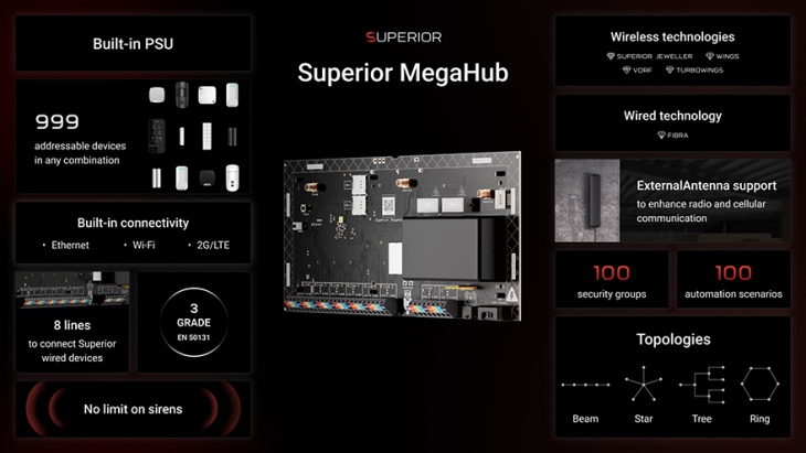 El protagonista de la presentación fue el Superior MegaHub, el hub Ajax más potente hasta la fecha. Admite hasta 999 dispositivos cableados o inalámbricos en cualquier combinación y no tiene límite de sirenas. Como dispositivo de Grade 3, está preparado para cubrir los emplazamientos más exigentes y ofrecer una protección certificada contra el sabotaje. Admite 100 grupos, 100 escenarios de automatización y 1.000 usuarios. Centros comerciales, centros de negocios, fábricas, instalaciones logísticas y grandes almacenes: todos pueden protegerse con un único panel de control.