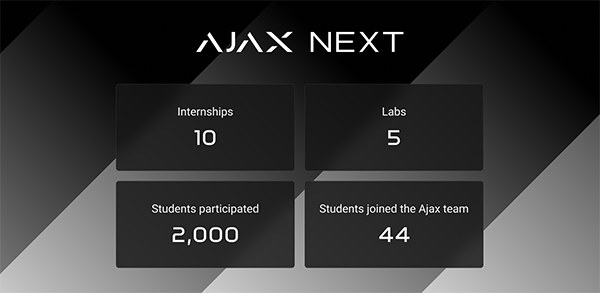 Ajax Systems sigue comprometida a tender puentes entre la educación académica y la ingeniería práctica para los estudiantes ucranianos. Tras poco más de un año de la iniciativa educativa Ajax Next, el equipo de Ajax se ha asociado con las principales universidades ucranianas para poner en marcha decenas de proyectos, capacitando a 2.000 estudiantes para dar sus primeros pasos en la ingeniería.