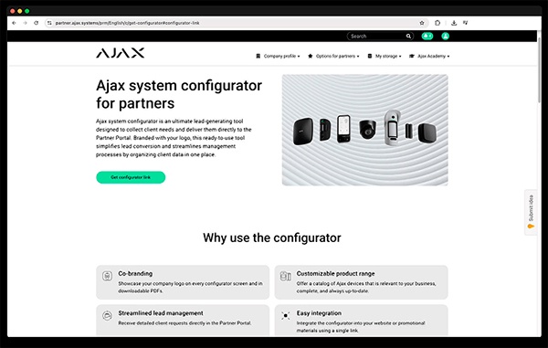Gracias al feedback recibido, el Partner Portal evolucionó hasta convertirse en una plataforma aún más potente para los partners de Ajax de todo el mundo. En 2025, uno de sus lanzamientos clave fue el Configurador de sistema Ajax para partners, una herramienta fundamental para la generación de leads. El configurador, de marca compartida y adaptado a las necesidades comerciales del partner, recopila leads de alta calidad y los envía directamente al Partner Portal, optimizando los flujos de trabajo desde las solicitudes iniciales hasta las propuestas comerciales y las instalaciones.