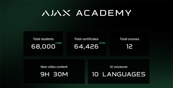 Ajax Academy, una plataforma educativa clave para los partners de Ajax en todo el mundo, siguió creciendo con fuerza en 2025. El número de estudiantes de la Academy mostró un crecimiento abrumador del 124% en comparación con el año pasado, mientras que el total de certificados emitidos superó los 64.000. Además, para ayudar a los partners de Ajax a dominar el producto de la empresa más rápidamente, Ajax Academy ha aprovechado el poder de la IA. Ahora, sus cursos en video hablan 10 idiomas y son más accesibles que nunca.